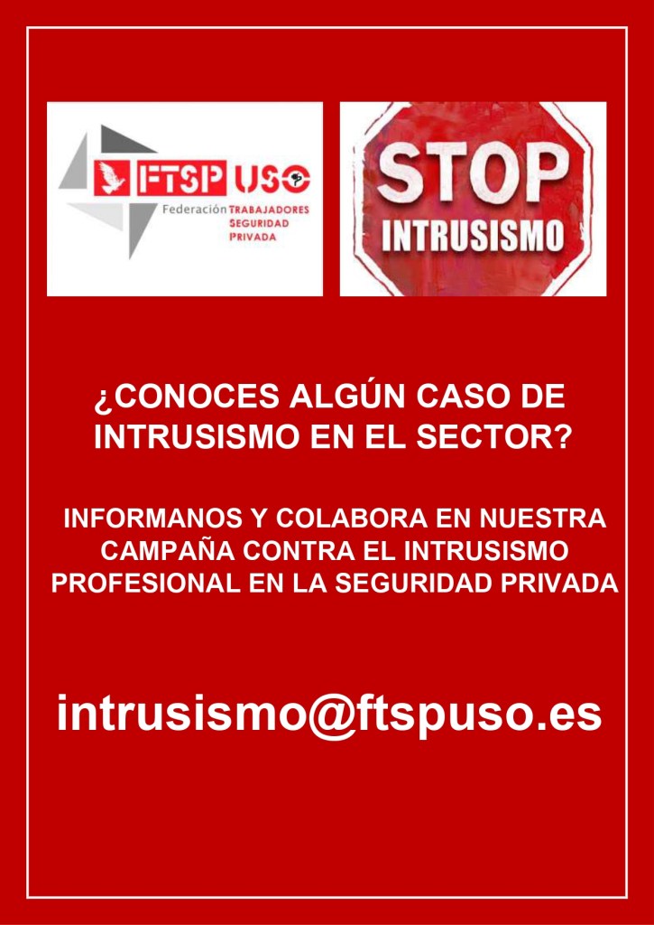 LA FEDERACIÓN DE TRABAJADORES DE SEGURIDAD PRIVADA DE LA UNIÓN SINDICALOBRERA (FTSP-USO)Inicia una nueva campaña contra el intrusismo en el sector de la Seguridad Privada ante el repunte de servicios contratados,unos por las Administraciones Públicas y otros porclientes privados,con empresas no registradas ni autorizadas por el Ministerio del Interior y/o compañías que prestan servicios de Seguridad Privada con personal no habilitado.Esta práctica cada vez más extendida,impide el que vigilantes de seguridad perfectamente formados y habilitados para esas labores se vean en el paro y sin opciones de encontrar un servicio que les requiera.Por lo anteriormente expuesto a través de esta campaña,damos el pistoletazo de salida a esta acción,esperando contar con la colaboración de todo el sector, abriendo canales de contacto en el que tendréis la opción decomunicarnos de formatotalmente anónima(Política de privacidad)todoslos casos en los que creáis que hay indicios de intrusismo para que procedamos a su verificación y denuncia.Correo electrónico para la denuncia:intrusismo@ftspuso.es