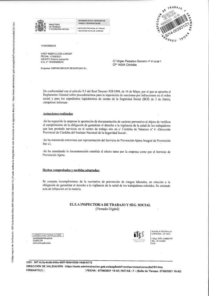 Tras la denuncia presentada en la Inspección Provincial de Trabajo y Seguridad Social de Córdoba, la empresa es sancionada mediante acta de infracción por incumplimiento en la vigilancia de la salud de los trabajadores del centro de trabajo en Córdoba.