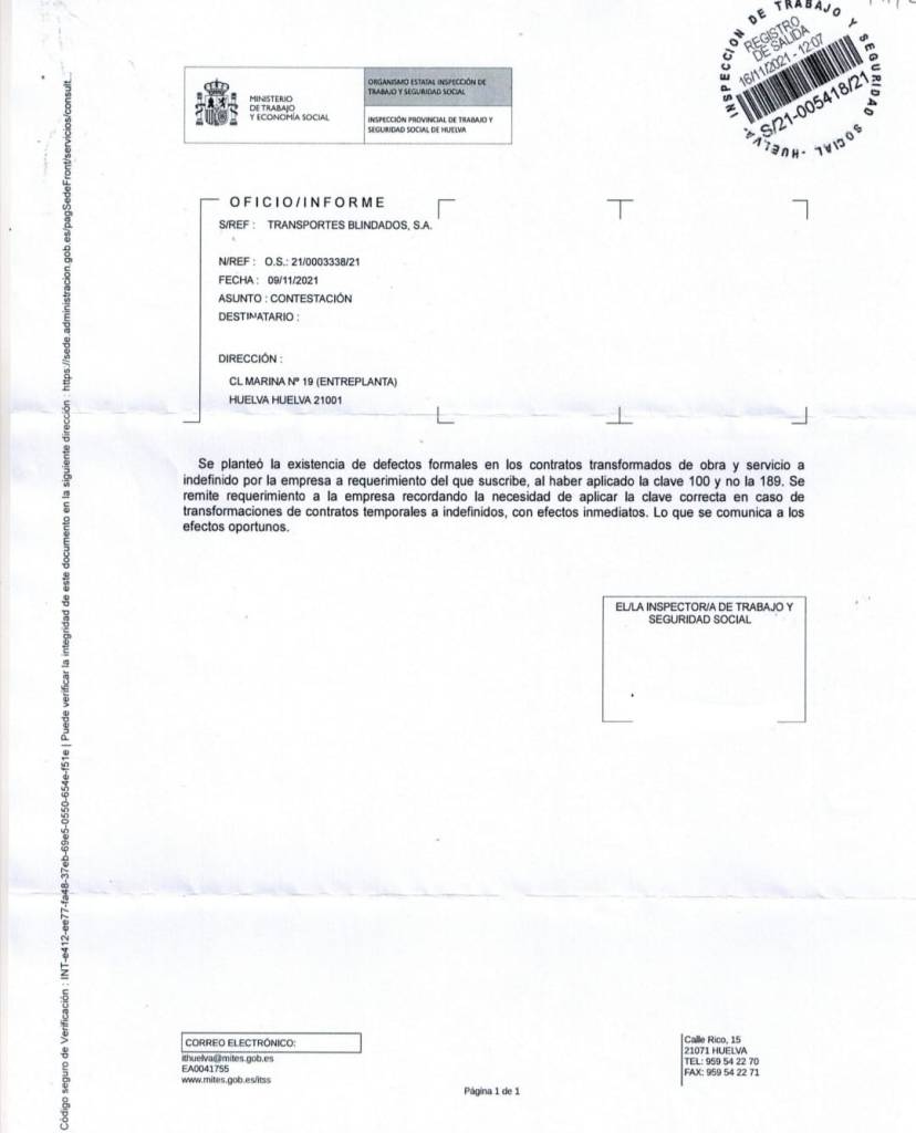 Posteriormente con fecha 09 de abril de 2021,La FTSP-USO Andalucía vuelve a interponer denuncia contra la empresa TRABLISA ante la I.T.S.S. de Huelva al detectarse que la misma no utilizaba el modelo de contrato correcto (modelo 189), en el día de hoy hemos recibido la correspondiente resolución en la que resuelven requerir a la empresa recordando la necesidad de aplicar la clave correcta en caso de contratos temporales a indefinidos, con carácter inmediato.