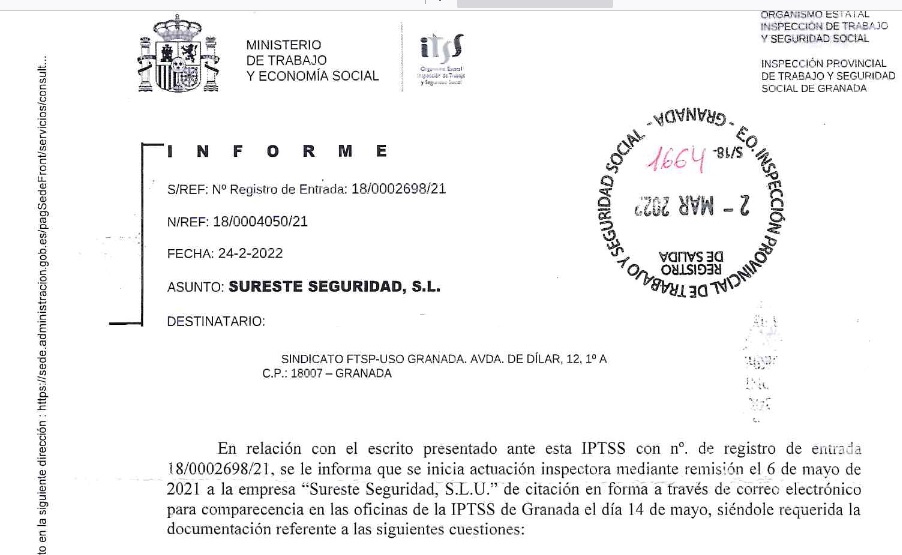 En fecha próxima la Federación de Trabajadores de Seguridad Privada ha recibido en la sede de Granada un acta de infracción contra Sureste Seguridad S.L.U. Tras la denuncia interpuesta por nuestro responsable provincial, inspección de trabajo se ha pronunciado a nuestro favor y ha procedido a levantar acta de infracción por no respetar, la citada mercantil, el tiempo de descanso entre jornada y jornada y por no dar a la delegada sindical la información a la que tiene derecho por el ejercicio de su cargo.