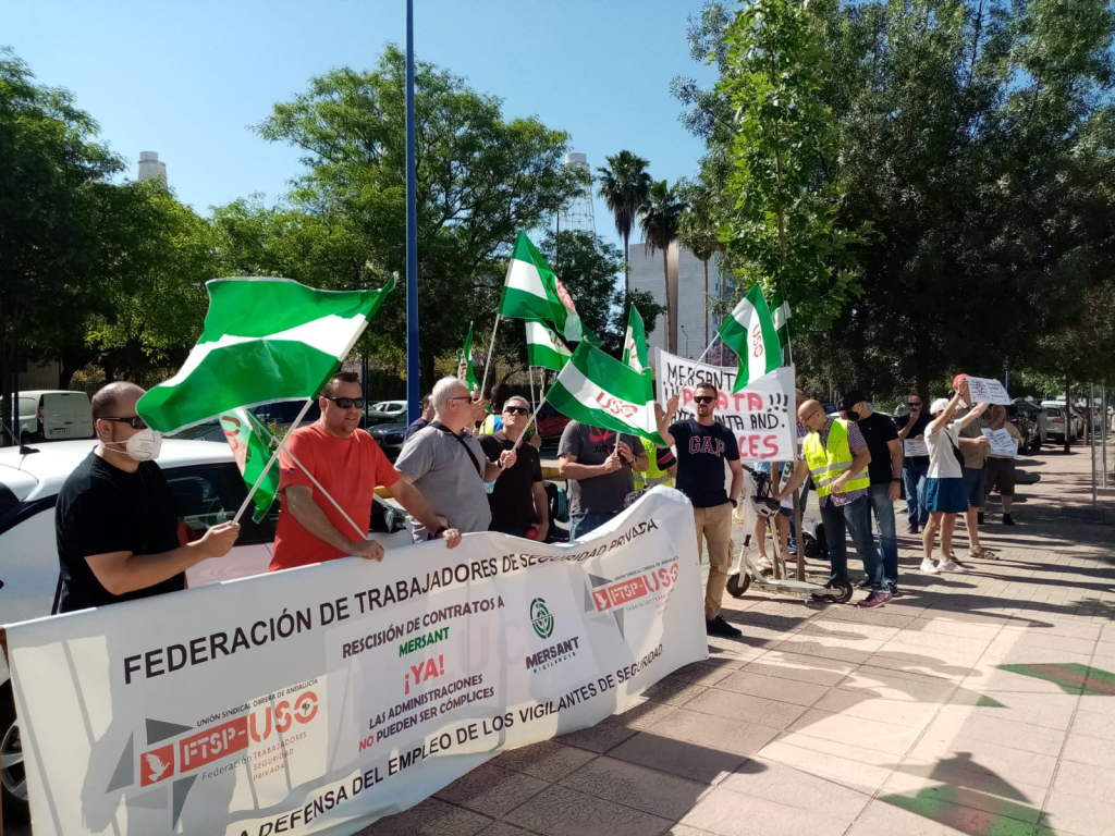 La Federación de Trabajadores de Seguridad Privada de USO Andalucía se concentra hoy en las puertas de la sede central del Servicio Andaluz de Empleo, en Sevilla, para protestar por las irregularidades en la empresa Mersant que abastece del servicio de seguridad, entre otros, a esta administración.