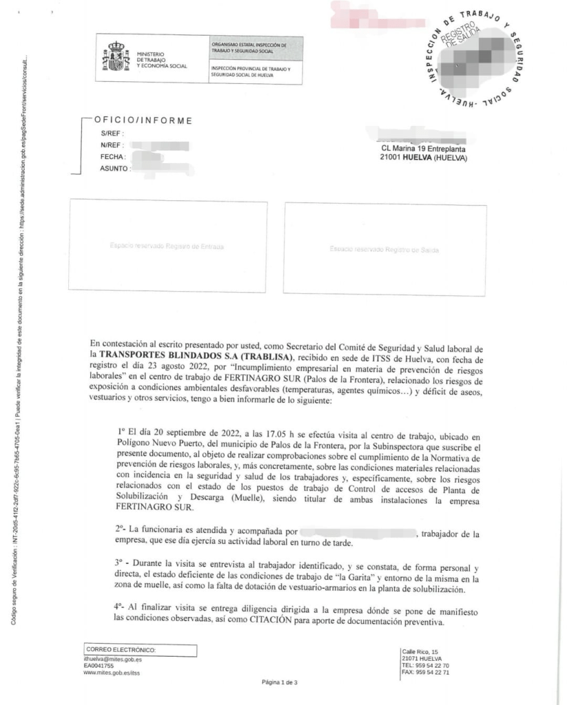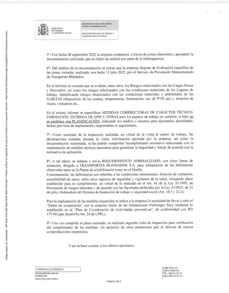 La Federación de Trabajadores de Seguridad Privada de USO Andalucía obtiene otro éxito en Huelva al recibir resolución favorable de Inspección de Trabajo en un conflicto contra Trablisa. En concreto la resolución ratifica un incumplimiento en materia de prevención de riesgos laborales. Y más concretamente sobre la condiciones materiales relacionadas con incicencias en la seguridad y salud de los trabajadores de seguridad privada y especificamente sobre los riesgos relacionados con el estado de los puestos de trabajo de control de acceso de planta de solubilización y descarga (muelle). Estas son instalaciones de la Fertinagro Sur que contrata a la empresa de seguridad objeto de resolucion.