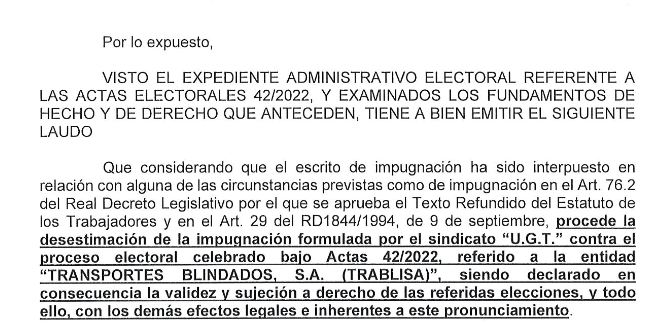 «[…] procede la desestimación de la impugnación formulada por el sindicato UGT contra el proceso electoral celebrado bajo Actas 42/2022, referido a la entidad Transportes Blindados S.A. (Trablisa), siendo declarado en consecuencia la validez y sujección a derecho de las referidas elecciones, y todo ello, con los demás efectos legales e inherentes a este pronunicamiento.»