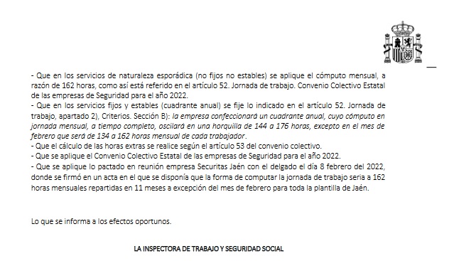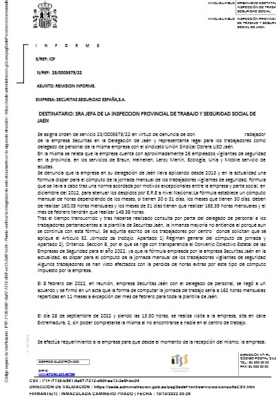Reciéntemente la Inspección de Trabajo y Seguridad Social ha emitido informe favorable para la FTSP USO Andalucía al requerir a la empresa Securitas en Jaen el cumplimiento del Convenio Colectivo, coincidente con el acuerdo que tenia esta empresa con el Comité de empresa en materia de computo de la jórnada de trabajo.