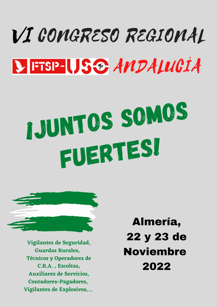 Se inicia hoy una nueva etapa de la Federación de Trabajadores de Seguridad Privada de USO Andalucía llena de entusiasmo. Tras el VI Congreso regional de esta federación se ha nombrado a una nueva ejecutiva dispuesta a seguir los objetivos del plan de acción y los compromisos adquiridos con los trabajadores del sector. Siguiendo el lema, este congreso ha sido por la unión de todas las categorías profesionales que forman el sector de la seguridad privada. Importante destacar que es la primera vez que se celebra en Almería, lo cual es un motivo de gran satisfacción.