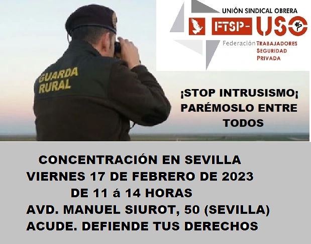 La Federación de Trabajadores de Seguridad Privada de USO Andalucía organiza una concentración en Sevilla el próximo 17 de febrero en la Avd. Manuel Siurot, 50, de Sevilla para mostrar su repulsa y la mas enérgica oposición al lamentable estado de intrusismo profesional no solo en el sector en general sino en concreto en los Guardas Rurales.