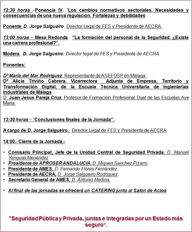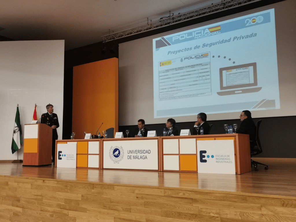 En el día de hoy se ha celebrado en Málaga las jornadas:»La Seguridad Privada, el presente y el futuro del sector». Sitas en la Universidad de Málaga, ha intervenido diferentes entidades empresariales, como Aproser, así como el Subdelegado del Gobierno, Javier Salas Ruiz, el Comisario Principal y Secretario General de la DAO, Pablo Muñoz de Mora, el Comisario Principal de la Unidad Central de Seguridad Privada, Manuel Yanguas Menéndez, y el Coronel Jefe de la comandancia de la Guardia Civil de Málaga, Roberto Blanes González.