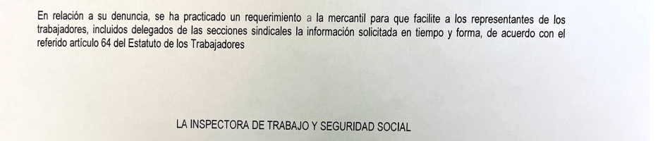 En relación a una denuncia planteada por una de nuestras delegadas, AM, la ITSS citó a la mercantil Sureste Seguridad y resolvió que esta deberá entregar a la representación laboral, incluidos los delegados de las secciones sindicales, toda la documentación que le soliciten en tiempo y forma, según el artículo 64 del Estatuto de los Trabajadores.