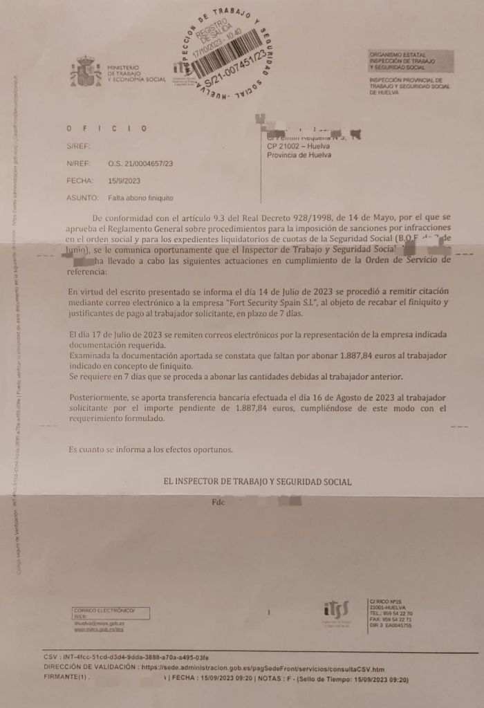La Inspección de Trabajo de Huelva ha dictado resolución contra Fort Security Spain y le obliga a abonar el finiquito a un afiliado en el plazo de 7 dias. Este es otro de los éxitos de FTSP USO-A en la defensa de los derechos de los trabajadores, puesto que es la consecuencia de una de sus denuncias. Además no es la primera vez que se denuncia a esta empresa por parte de la federación.