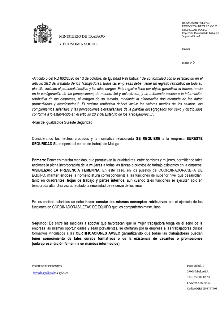La resolución destaca la necesidad de realizar una igualdad efectiva entre hombres y mujeres en los puestos de trabajo y en los conceptos retributivos. A su vez inspección de trabajo, según indicó la denuncia interpuesta previamente por la FTSP USO-A, exige la equiparación en materia de formación como responsabilidad de la mercantil.