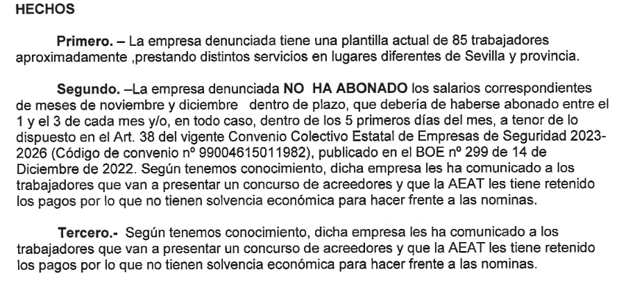 La Federación de Trabajadores de Seguridad Privada de USO Andalucía en la provincia de Sevilla ha formulado denuncia por impago contra la empresa AM Seguridad.