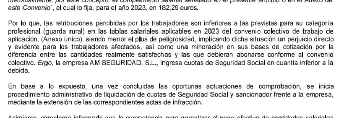 La resolución recoge el reconocimiento de que a estos Guardas Rurales no se les aplicaba el tabla salarial establecida en convenio y que se le exigió a AM Seguridad dicho pago. A su vez dicha resolución expone que ante el nuevo incumplimiento de la empresa Inspección de Trabajo a resuelto levantar acta de infracción contra la mercantil.