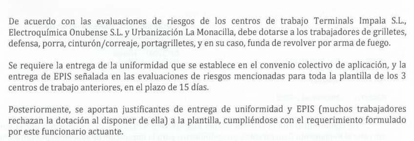 La Federación de Trabajadores de Seguridad Privada de USO Andalucía, en Huelva, ha obtenido resolución favorable contra HETECSE S.A. Gracias a esto la mercantil tendrá que facilitar a sus trabajadores la uniformidad al completo según lo estipulado en el artículo 23 del convenio colectivo estatal de empresas de seguridad.