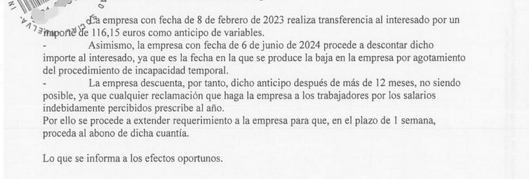 Al parecer la mercantil descontó a un trabajador la cantidad de un anticipo, solicitado por el mismo, más de un año antes. Inspección de Trabajo aclara que no es posible reclamar esa cantidad a un trabajador con posterioridad a 12 meses por lo que obliga a la empresa a hacerle el ingreso con esa cantidad económica en el plazo de una semana.