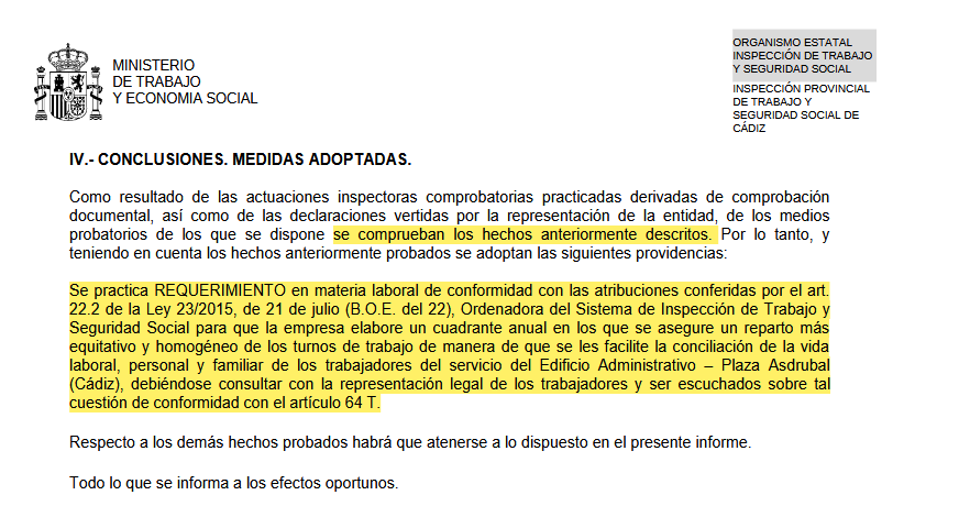 La inspección de trabajo constata que se ha producido un reparto irregular de los turnos en el Edificio Asdrúbal de la Junta de Andalucía en Cádiz. Por ello ahora ha recibido un requerimiento para redistribuir los turnos de manera que permita la Conciliación de la Vida Laboral y la Familiar de todos los trabajadores.