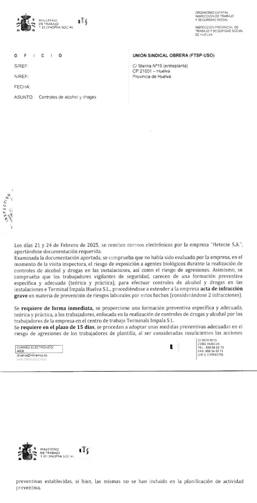 La FTSP USO-Huelva obtiene resolución favorable de Inspección de trabajo.
