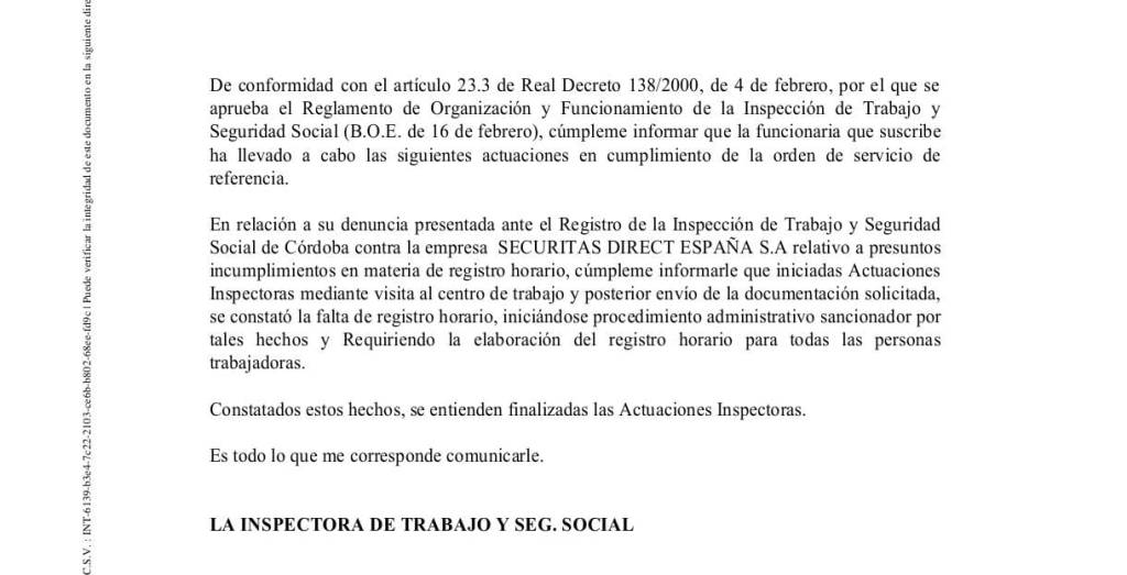Córdoba, 26 Febrero 2026 — La Inspección Provincial de Trabajo y Seguridad Social ha resuelto una actuación inspectora contra Securitas Direct España en la provincia de Córdoba, tras detectar un incumplimiento grave de la normativa laboral en materia de control de jornada laboral.