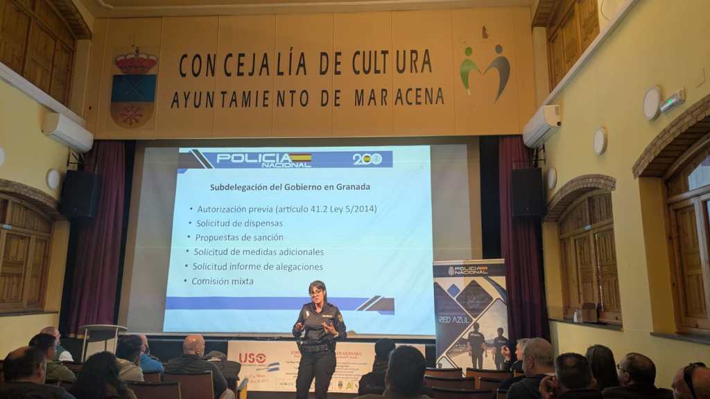 A continuación, tomó la palabra la inspectora de la Unidad Territorial de Seguridad Privada en Granada, Doña María José Ramírez Campos, quien explicó en detalle el funcionamiento de esta unidad. Durante su intervención, volvió a incidir en la relevancia de la comunicación y cooperación constante con los vigilantes de seguridad, como pieza clave para garantizar una actuación coordinada y eficiente.